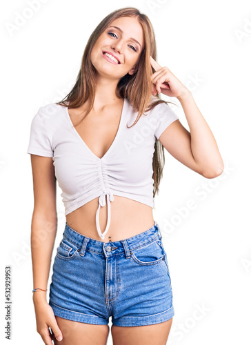 Young beautiful blonde woman wearing casual white tshirt smiling pointing to head with one finger, great idea or thought, good memory