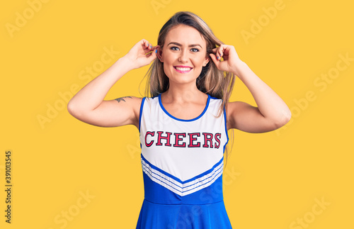 Young beautiful blonde woman wearing cheerleader uniform smiling pulling ears with fingers, funny gesture. audition problem