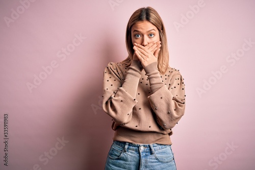Young beautiful blonde woman wearing fashion sweater over pink isolated background shocked covering mouth with hands for mistake. Secret concept.