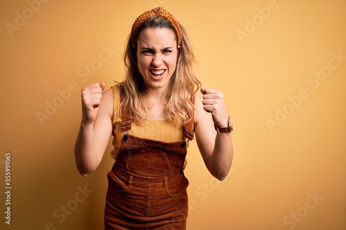 Young beautiful blonde woman wearing overalls and diadem standing over yellow background angry and mad raising fists frustrated and furious while shouting with anger. Rage and aggressive concept.