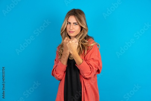 young beautiful blonde woman wearing overshirt Ready to fight with fist defense gesture, angry and upset face, afraid of problem.