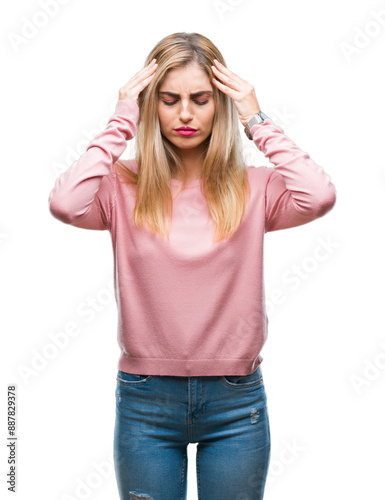 Young beautiful blonde woman wearing pink winter sweater over isolated background with hand on head for pain in head because stress. Suffering migraine.