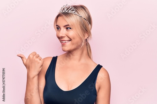 Young beautiful blonde woman wearing princess crown over isolated pink background pointing thumb up to the side smiling happy with open mouth