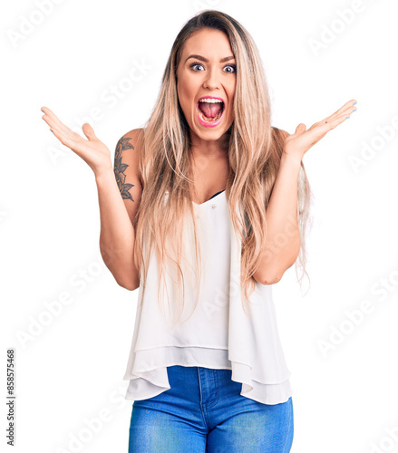 Young beautiful blonde woman wearing sleeveless t-shirt celebrating victory with happy smile and winner expression with raised hands