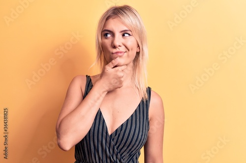 Young beautiful blonde woman wearing striped t-shirt standing over isolated yellow background thinking concentrated about doubt with finger on chin and looking up wondering