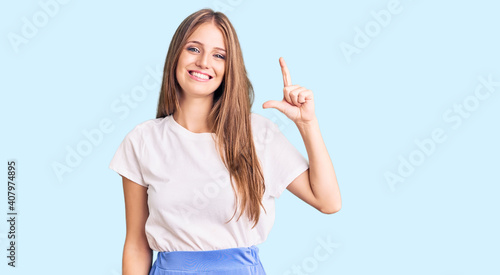 Young beautiful blonde woman wearing summer style smiling and confident gesturing with hand doing small size sign with fingers looking and the camera. measure concept.