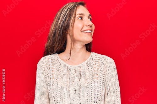 Young beautiful blonde woman wearing winter sweater over red isolated background looking to side, relax profile pose with natural face and confident smile.