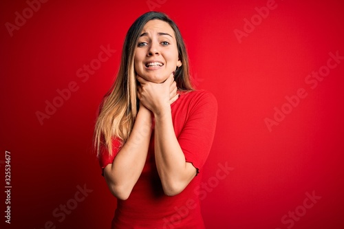 Young beautiful blonde woman with blue eyes wearing casual t-shirt over red background shouting and suffocate because painful strangle. Health problem. Asphyxiate and suicide concept.