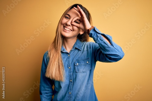Young beautiful blonde woman with blue eyes wearing denim shirt over yellow background doing ok gesture with hand smiling, eye looking through fingers with happy face.