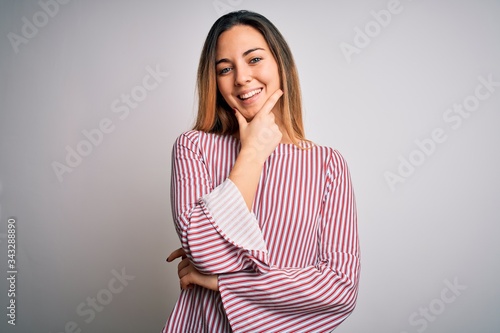 Young beautiful blonde woman with blue eyes wearing stiped t-shirt over white background looking confident at the camera smiling with crossed arms and hand raised on chin. Thinking positive.