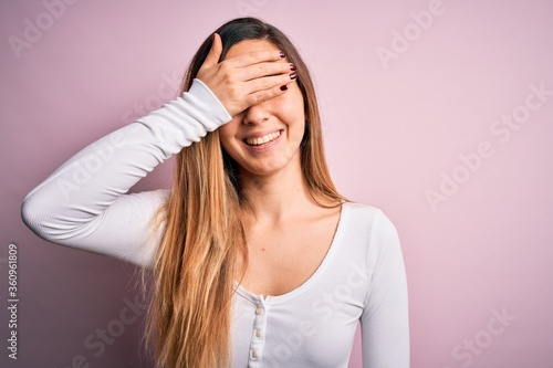 Young beautiful blonde woman with blue eyes wearing white t-shirt over pink background smiling and laughing with hand on face covering eyes for surprise. Blind concept.