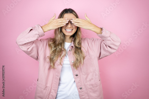 Young beautiful blonde woman with long hair standing over pink background covering eyes with hands smiling cheerful and funny. Blind concept.