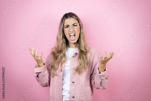 Young beautiful blonde woman with long hair standing over pink background crazy and mad shouting and yelling with aggressive expression and arms raised. Frustration concept.