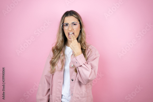 Young beautiful blonde woman with long hair standing over pink background disgusted with her hand inside her mouth