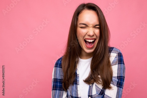 Young beautiful brunet woman. Trendy lady in casual summer hipster shirt . Positive female shows facial sincere emotions. Funny model isolated on pink background with free space
