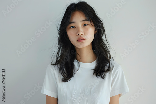 Young beautiful brunette asian woman model in white T-shirt posing on light grey background