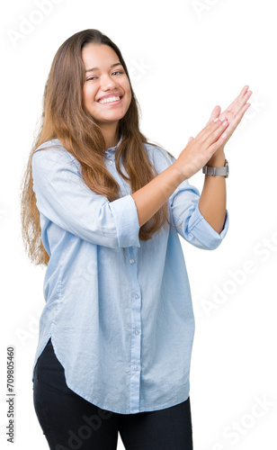 Young beautiful brunette business woman over isolated background Clapping and applauding happy and joyful, smiling proud hands together