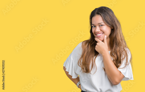 Young beautiful brunette business woman over isolated background looking confident at the camera with smile with crossed arms and hand raised on chin. Thinking positive.
