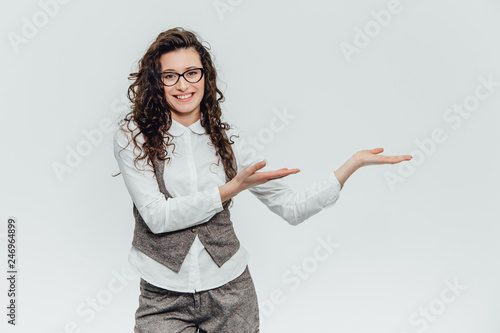 Young beautiful brunette business woman over isolated background. Smiling and looking at the camera pointing two hands and fingers to sid.