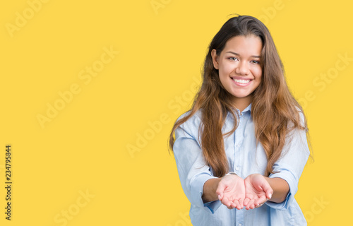 Young beautiful brunette business woman over isolated background Smiling with hands palms together receiving or giving gesture. Hold and protection