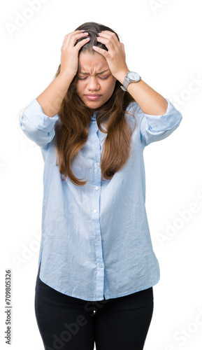 Young beautiful brunette business woman over isolated background suffering from headache desperate and stressed because pain and migraine. Hands on head.