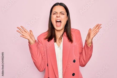 Young beautiful brunette businesswoman wearing elegant jacket over isolated pink background celebrating mad and crazy for success with arms raised and closed eyes screaming excited. Winner concept