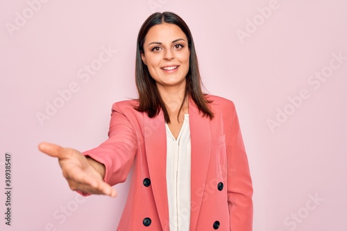 Young beautiful brunette businesswoman wearing elegant jacket over isolated pink background smiling cheerful offering palm hand giving assistance and acceptance.