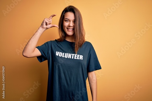 Young beautiful brunette girl doing volunteering wearing t-shirt with volunteer message word smiling and confident gesturing with hand doing small size sign with fingers looking and the camera.