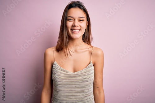 Young beautiful brunette girl wearing casual striped t-shirt over isolated pink background with a happy and cool smile on face. Lucky person.