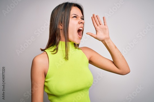 Young beautiful brunette girl wearing casual summer t-shirt over isolated white background shouting and screaming loud to side with hand on mouth. Communication concept.
