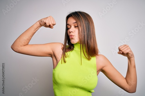 Young beautiful brunette girl wearing casual summer t-shirt over isolated white background showing arms muscles smiling proud. Fitness concept.