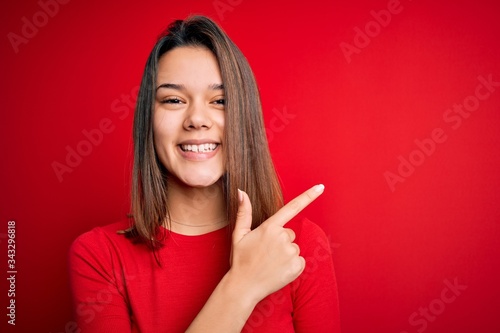 Young beautiful brunette girl wearing casual t-shirt over isolated red background cheerful with a smile on face pointing with hand and finger up to the side with happy and natural expression