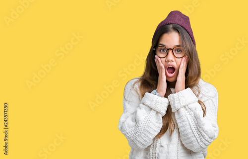 Young beautiful brunette hipster woman wearing glasses and winter hat over isolated background afraid and shocked with surprise expression, fear and excited face.