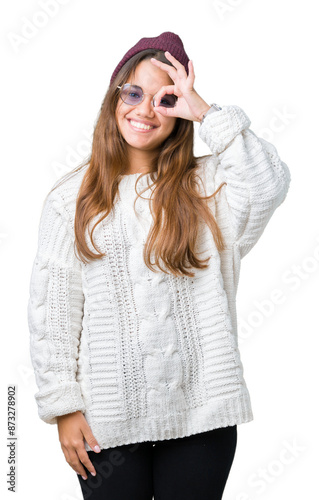 Young beautiful brunette hipster woman wearing sunglasses over isolated background doing ok gesture with hand smiling, eye looking through fingers with happy face.