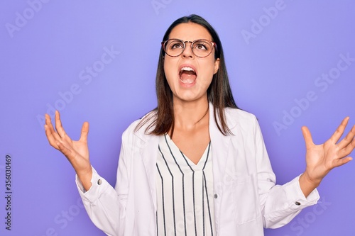 Young beautiful brunette psychologist woman wearing coat and glasses over purple background crazy and mad shouting and yelling with aggressive expression and arms raised. Frustration concept.