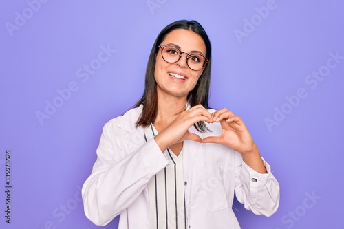 Young beautiful brunette psychologist woman wearing coat and glasses over purple background smiling in love showing heart symbol and shape with hands. Romantic concept.