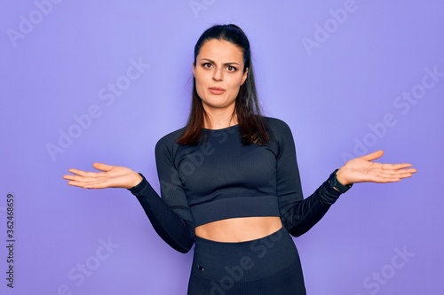 Young beautiful brunette sporty woman wearing casual sportswear over purple background clueless and confused with open arms, no idea concept.