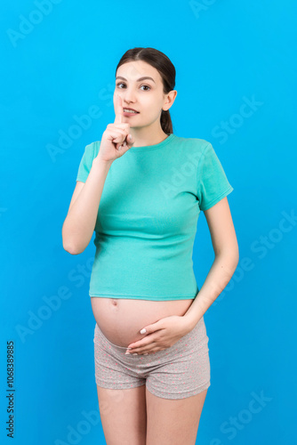Young beautiful brunette woman pregnant expecting baby over isolated colored background asking to be quiet with finger on lips. Maternity Silence and secret concept