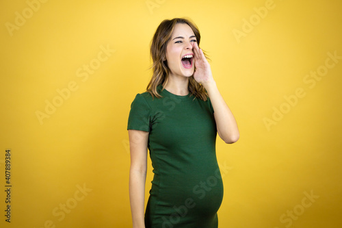 Young beautiful brunette woman pregnant expecting baby over isolated yellow background shouting and screaming loud to side with hand on mouth
