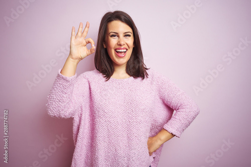 Young beautiful brunette woman wearing a sweater over pink isolated background smiling positive doing ok sign with hand and fingers. Successful expression.