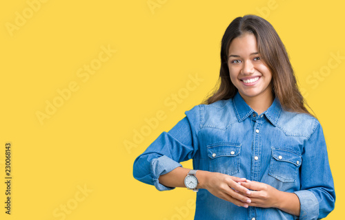 Young beautiful brunette woman wearing blue denim shirt over isolated background Hands together and fingers crossed smiling relaxed and cheerful. Success and optimistic