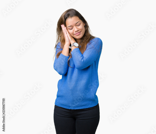 Young beautiful brunette woman wearing blue sweater over isolated background sleeping tired dreaming and posing with hands together while smiling with closed eyes.