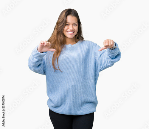 Young beautiful brunette woman wearing blue winter sweater over isolated background looking confident with smile on face, pointing oneself with fingers proud and happy.