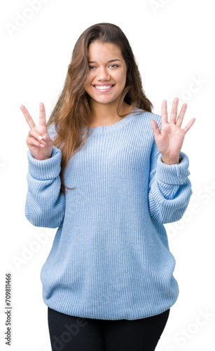 Young beautiful brunette woman wearing blue winter sweater over isolated background showing and pointing up with fingers number seven while smiling confident and happy.