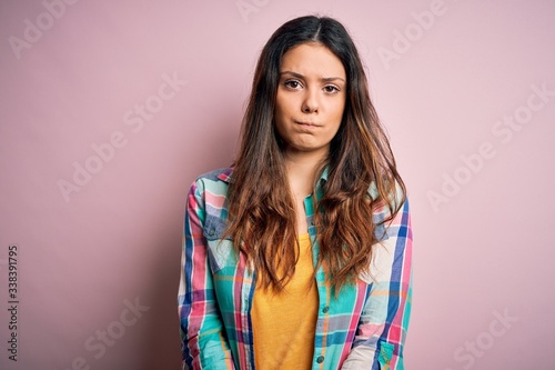 Young beautiful brunette woman wearing casual colorful shirt standing over pink background depressed and worry for distress, crying angry and afraid. Sad expression.