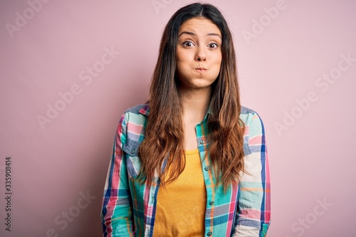 Young beautiful brunette woman wearing casual colorful shirt standing over pink background puffing cheeks with funny face. Mouth inflated with air, crazy expression.