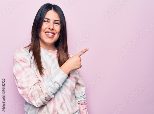 Young beautiful brunette woman wearing casual dyed sweatshirt over isolated pink background smiling cheerful pointing with hand and finger up to the side