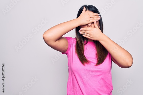 Young beautiful brunette woman wearing casual pink t-shirt standing over white background Covering eyes and mouth with hands, surprised and shocked. Hiding emotion