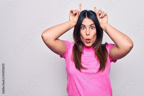 Young beautiful brunette woman wearing casual pink t-shirt standing over white background doing funny gesture with finger over head as bull horns