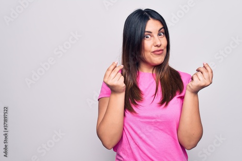 Young beautiful brunette woman wearing casual pink t-shirt standing over white background doing money gesture with hands, asking for salary payment, millionaire business